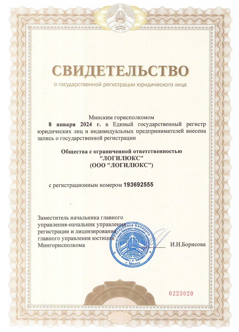 Свидетельство о государственной регистрации общества с ограниченной ответственностью "Логилюкс"